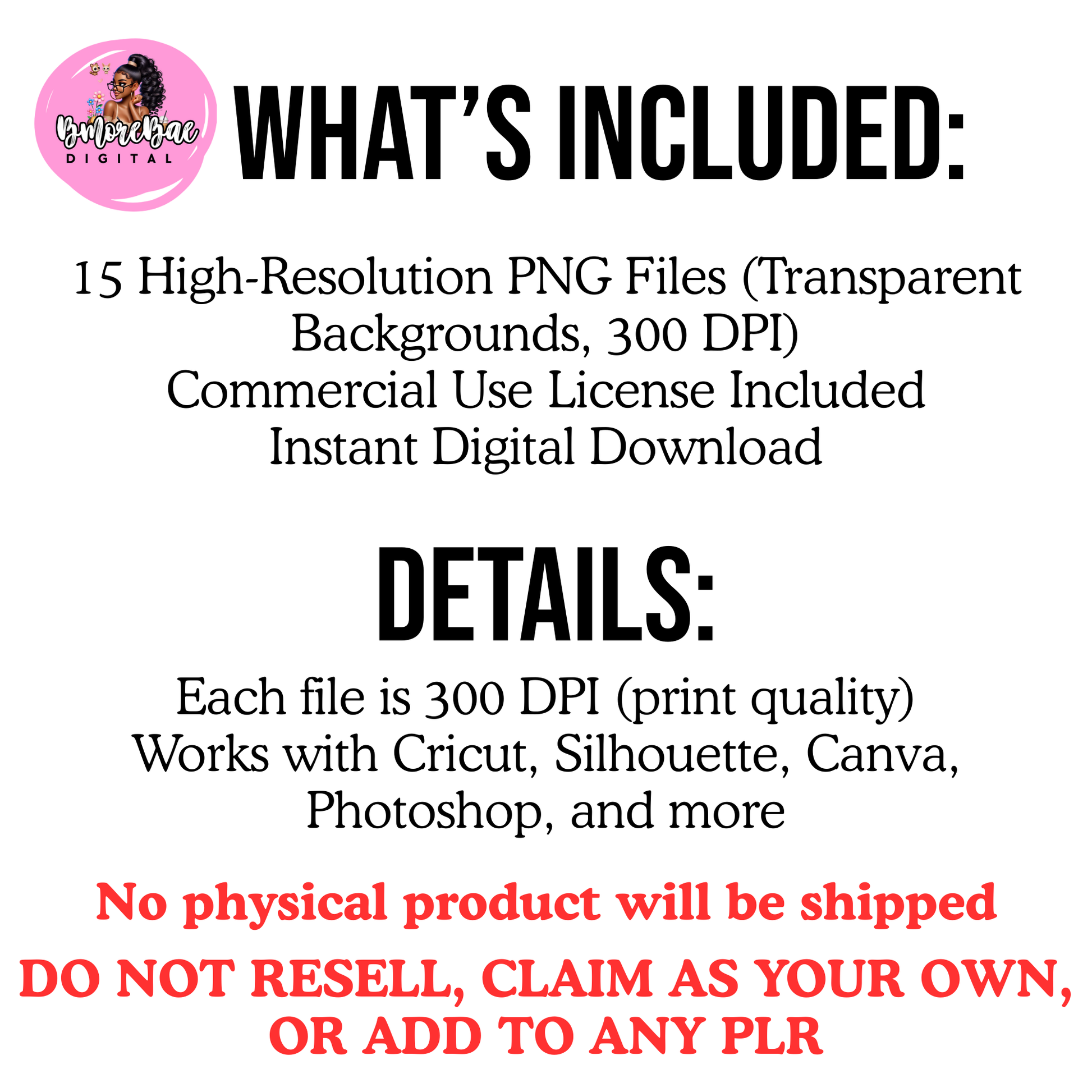Get ready to add some spooky sweetness to your crafts with this adorable set of 15 Black Girl Halloween Cuties! Perfect for sublimation, stickers, party invites, t-shirts, tote bags, and more. These cuties are dressed in pumpkin-themed outfits, rocking bows, beads, and braids—bringing melanin magic to your Halloween designs.