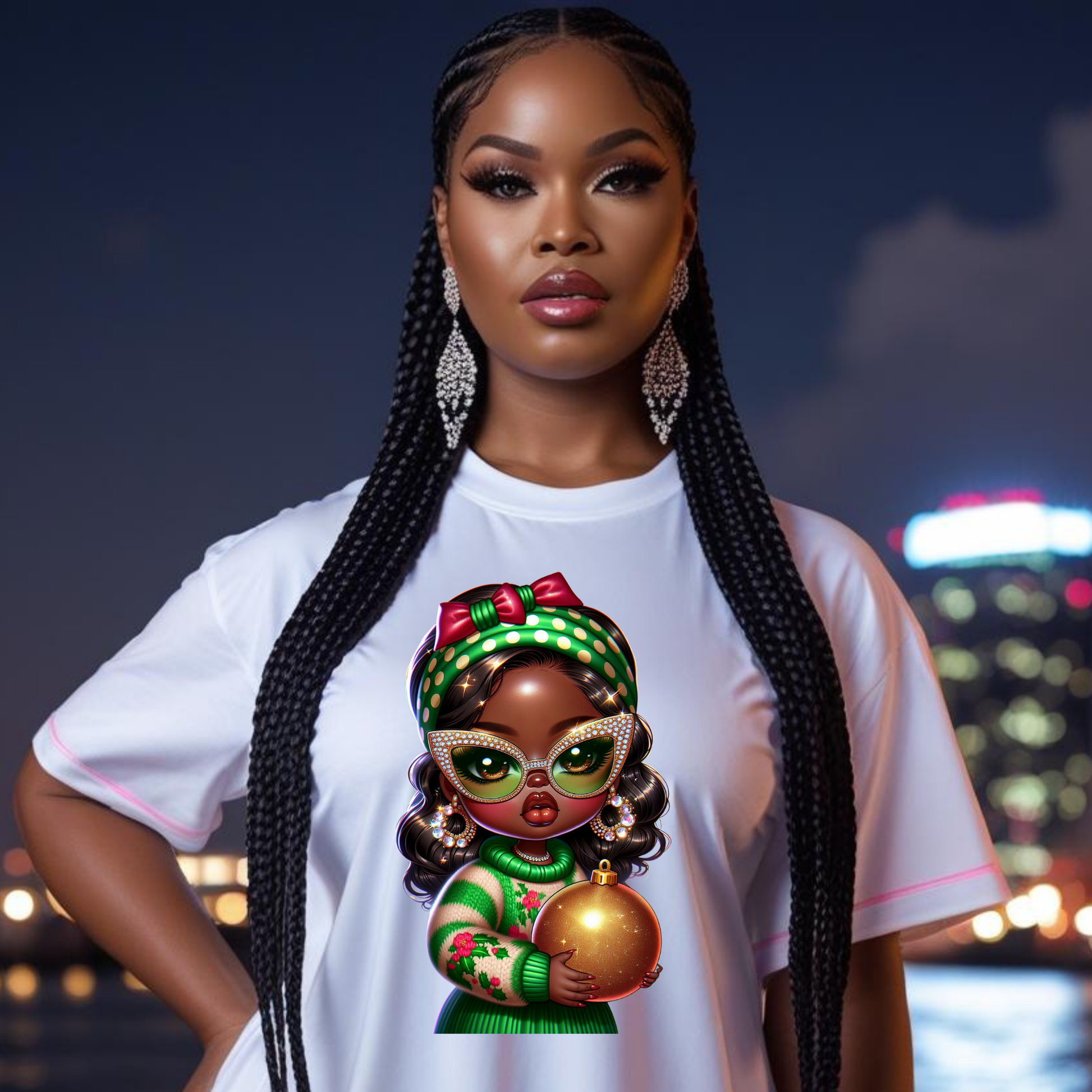 Glossy, luxurious, and hyper-detailed chibi illustrations featuring Black girls in festive holiday outfits — each rocking unique holiday accessories, cozy sweaters, and oversized glam glasses.