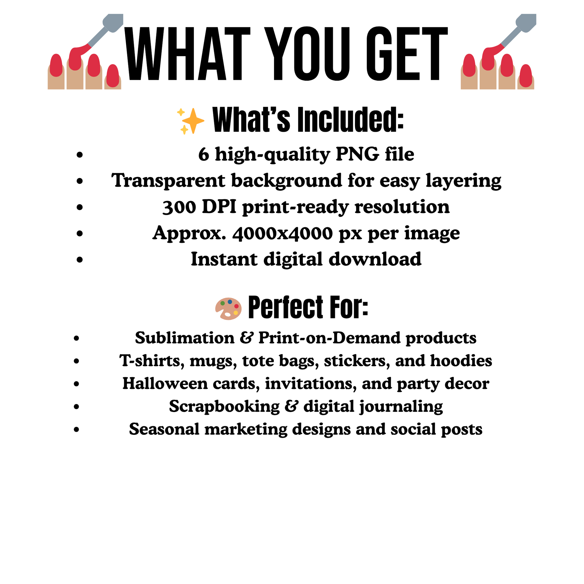 Not allowed: resell or share the raw PNGs, claim the artwork as your own, add to clipart/element packs, or use with any “printable marketplace” that redistributes the art as standalone files. POD is allowed when your design is a flattened composition (not extractable).