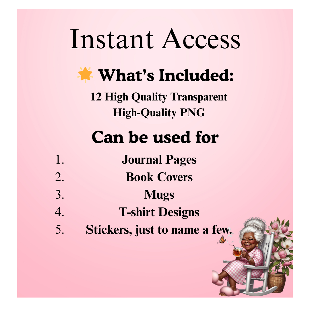 Bring warmth, joy, and style to your creative projects with the Cute Melanated Grannies Bundle! This pack includes 12 high-quality PNGs featuring stylish grandmothers with radiant melanin glow, rocking chic glasses, fluffy slippers, and cozy pink dresses while sipping tea in their rocking chairs. Perfect for adding character and charm to your designs, these grannies are ideal for: