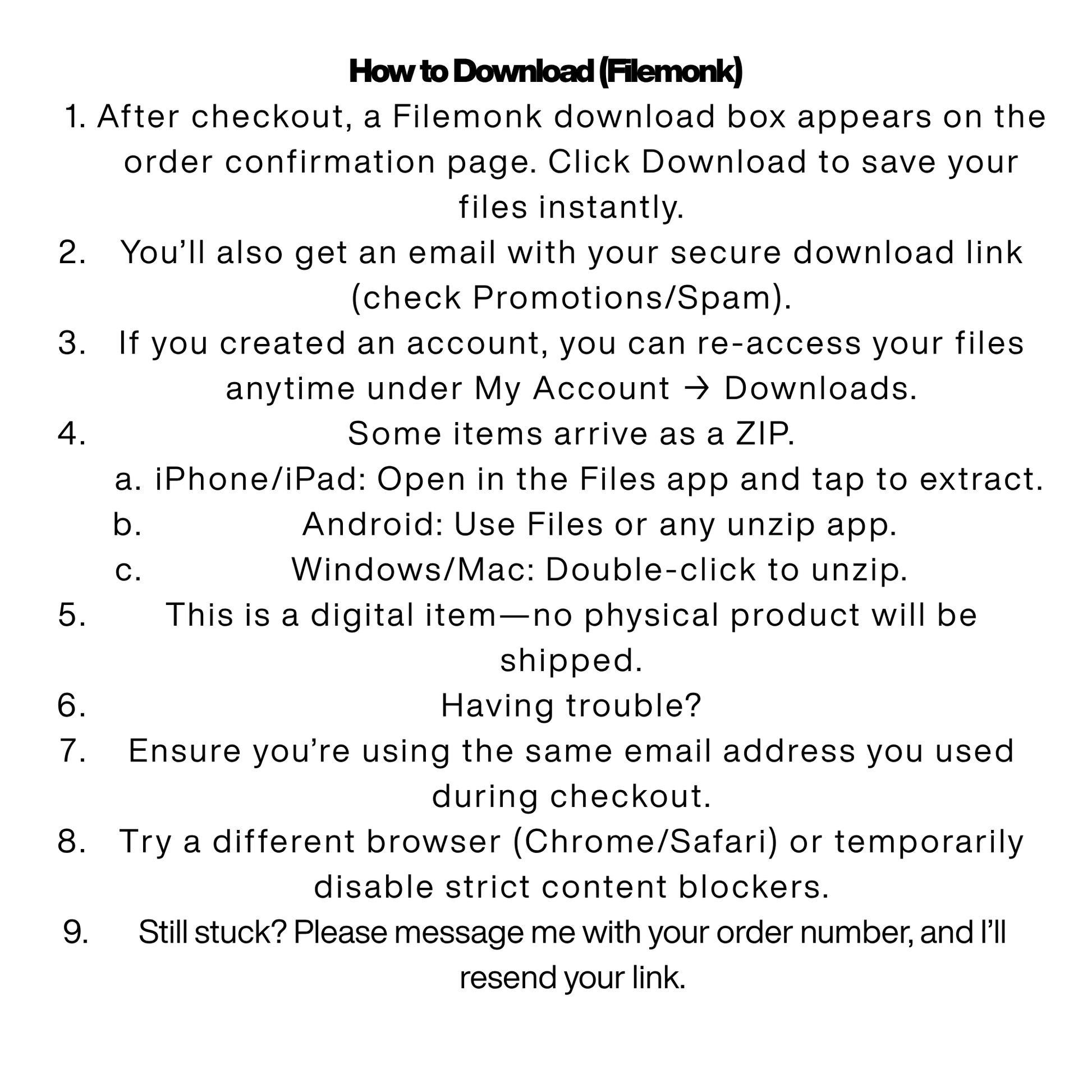 “After checkout you’ll see a Download button on the confirmation page. You’ll also get an email with your files. Lost the email? Log into your account → My Orders → Download.”