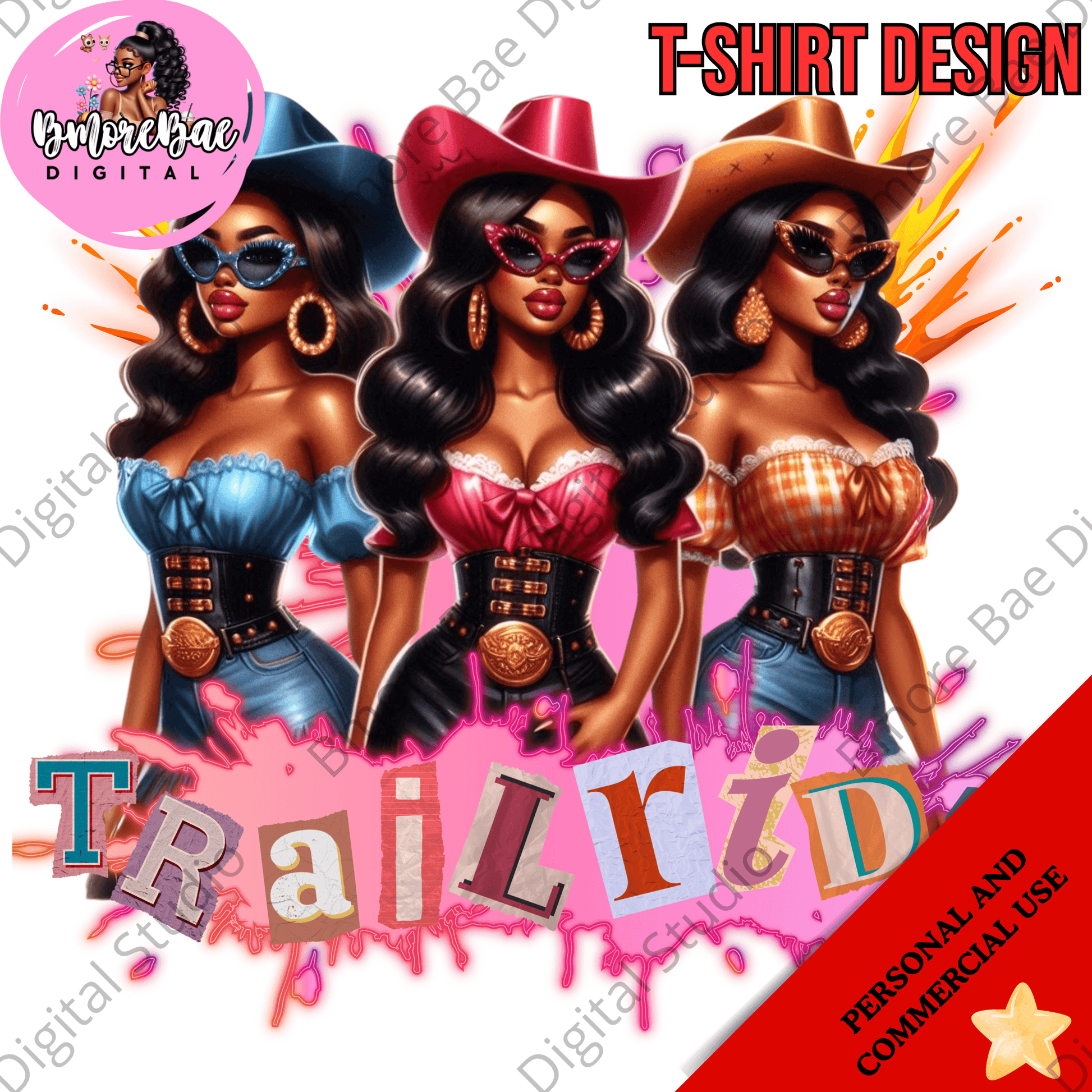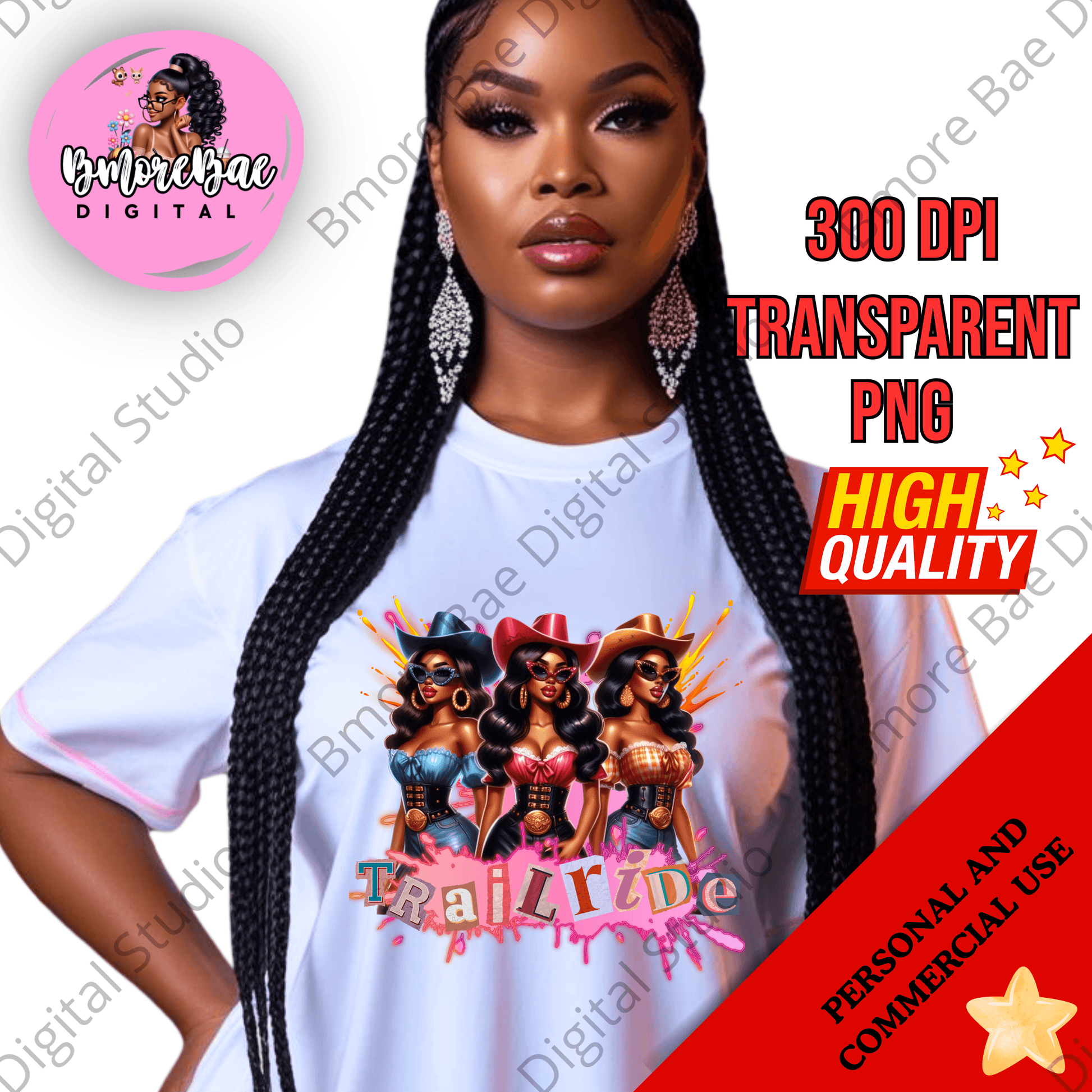 Saddle up in style with this Trailride Black Girl PNG β a bold and glamorous design that celebrates Black cowgirl culture with flair. ππΎπ€ Perfect for sublimation projects, this high-quality 300 DPI transparent PNG features three stylish cowgirls rocking colorful outfits, big hair, and cowgirl hats, ready to bring a fierce Western vibe to your creations.